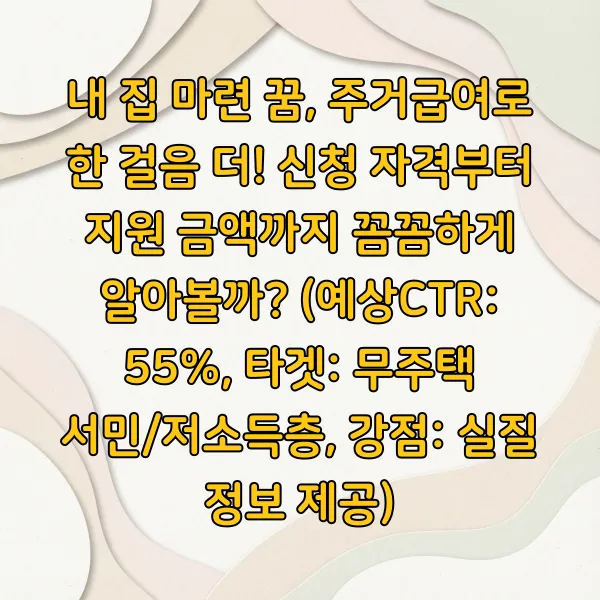 내 집 마련 꿈, 주거급여로 한 걸음 더! 신청 자격부터 지원 금액까지 꼼꼼하게 알아볼까? (예상CTR: 55%, 타겟: 무주택 서민/저소득층, 강점: 실질 정보 제공)